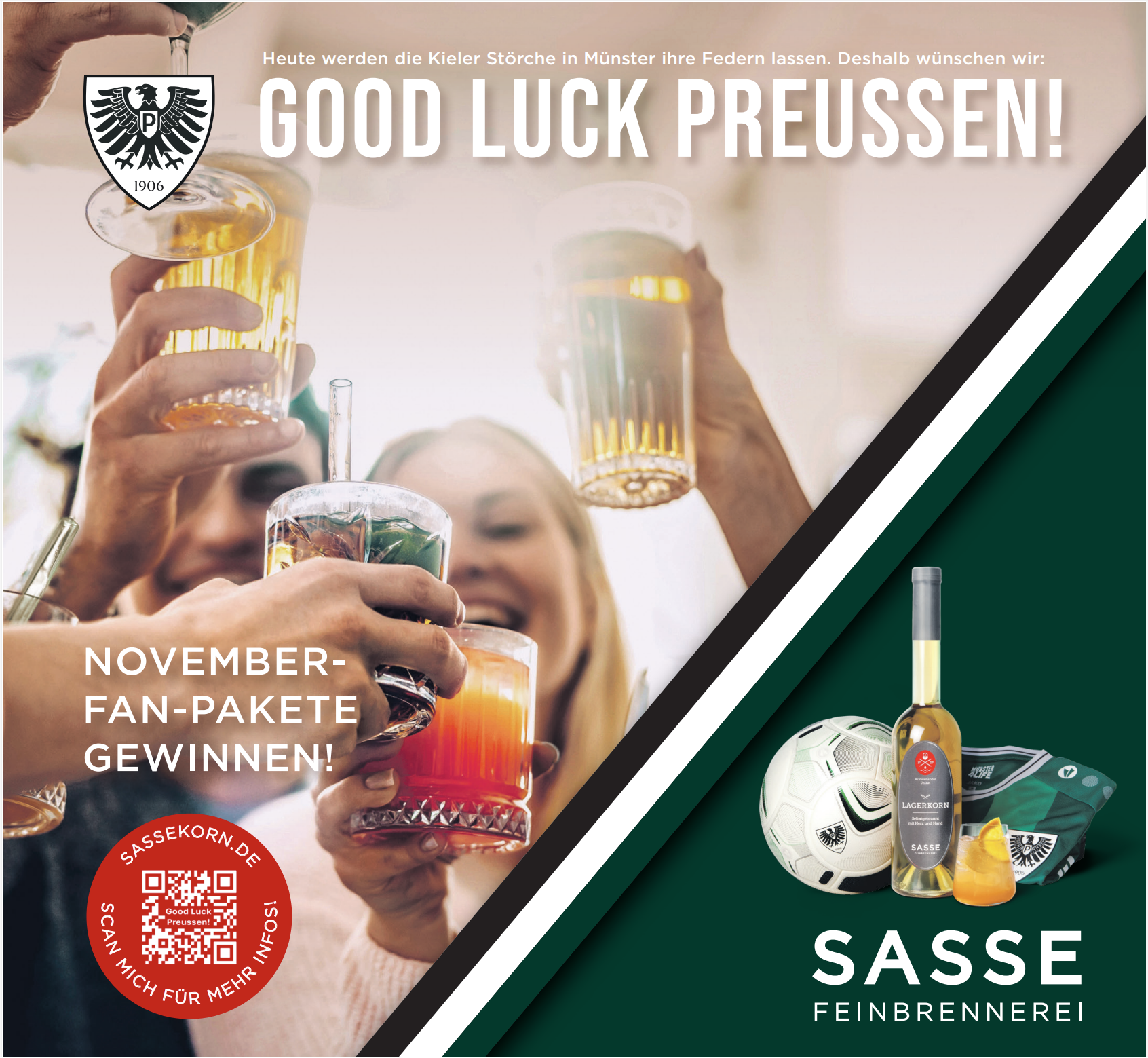 Unter allen Teilnehmenden gibt es 5 SCP-Pakete zu gewinnen. Diese beinhalten jeweils 1 Heimtrikot, 1 Fußball mit Preußen Logo und ein Sasse-Set bestehend aus Lagerkorn 0,5L + Winterzwetschge 0,7L + Zitronensaft 0,5L + Kakao mit Nuss 0,7L + Sechser 0,7L + Alte Marille 0,5L