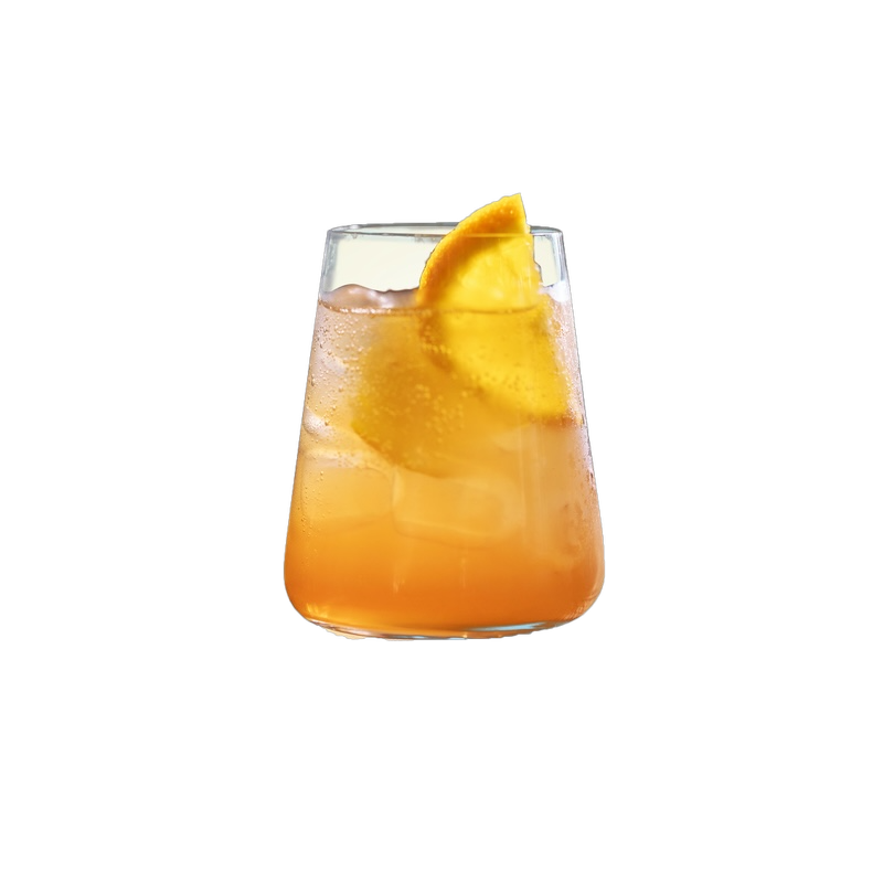 1. Alle Zutaten bis auf das Mineralwasser in ein Glas mit Eiswürfeln geben und kalt rühren.